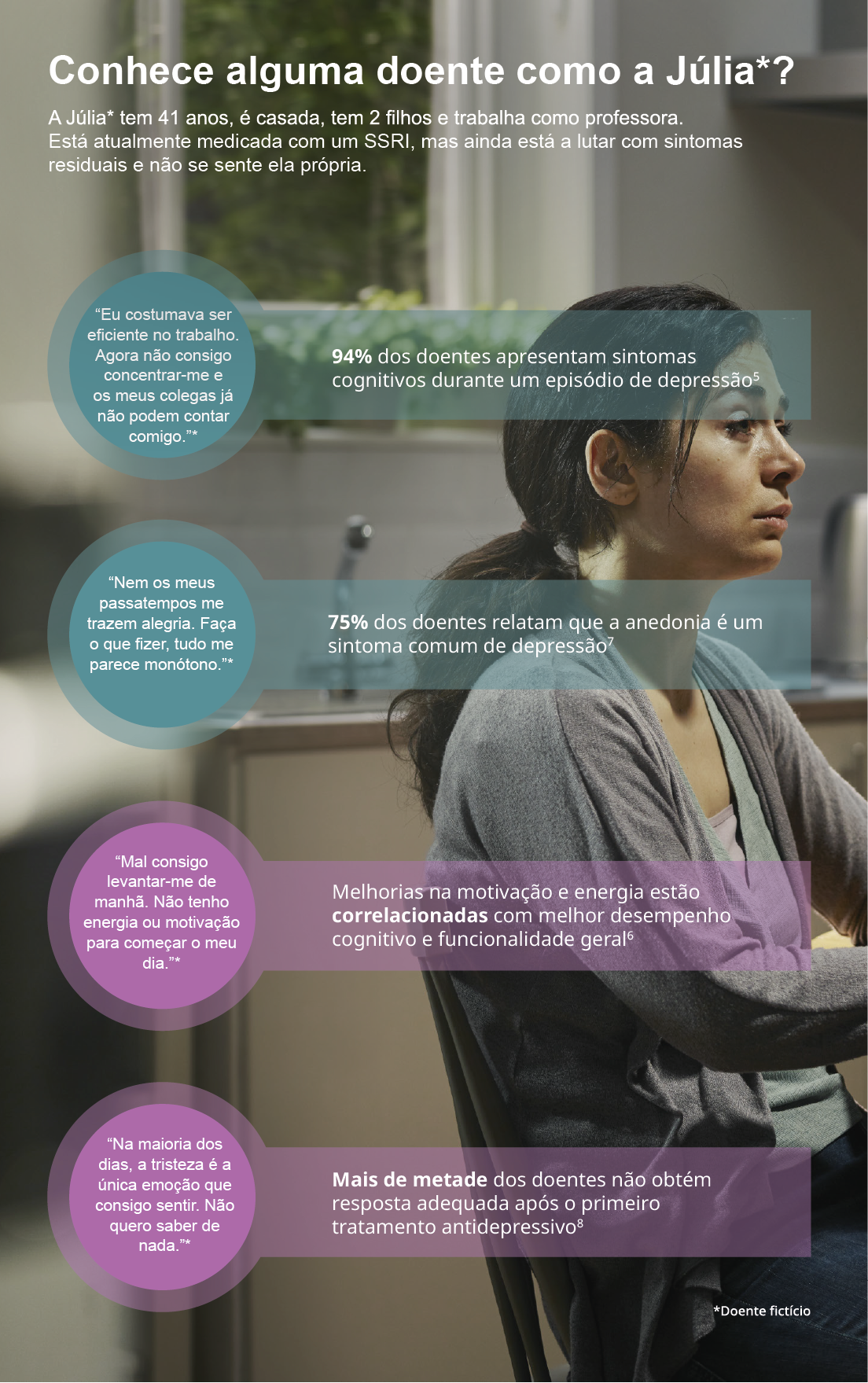 Com sintomas abrangendo os domínios emocional, físico e cognitivo, a variedade de sintomas da depressão é geralmente subestimada e pode fazer com que muitos doentes não se sintam eles próprios.1,3,4 Em seguida, apresentam-se alguns dos sintomas mais problemáticos dos doentes com depressão.